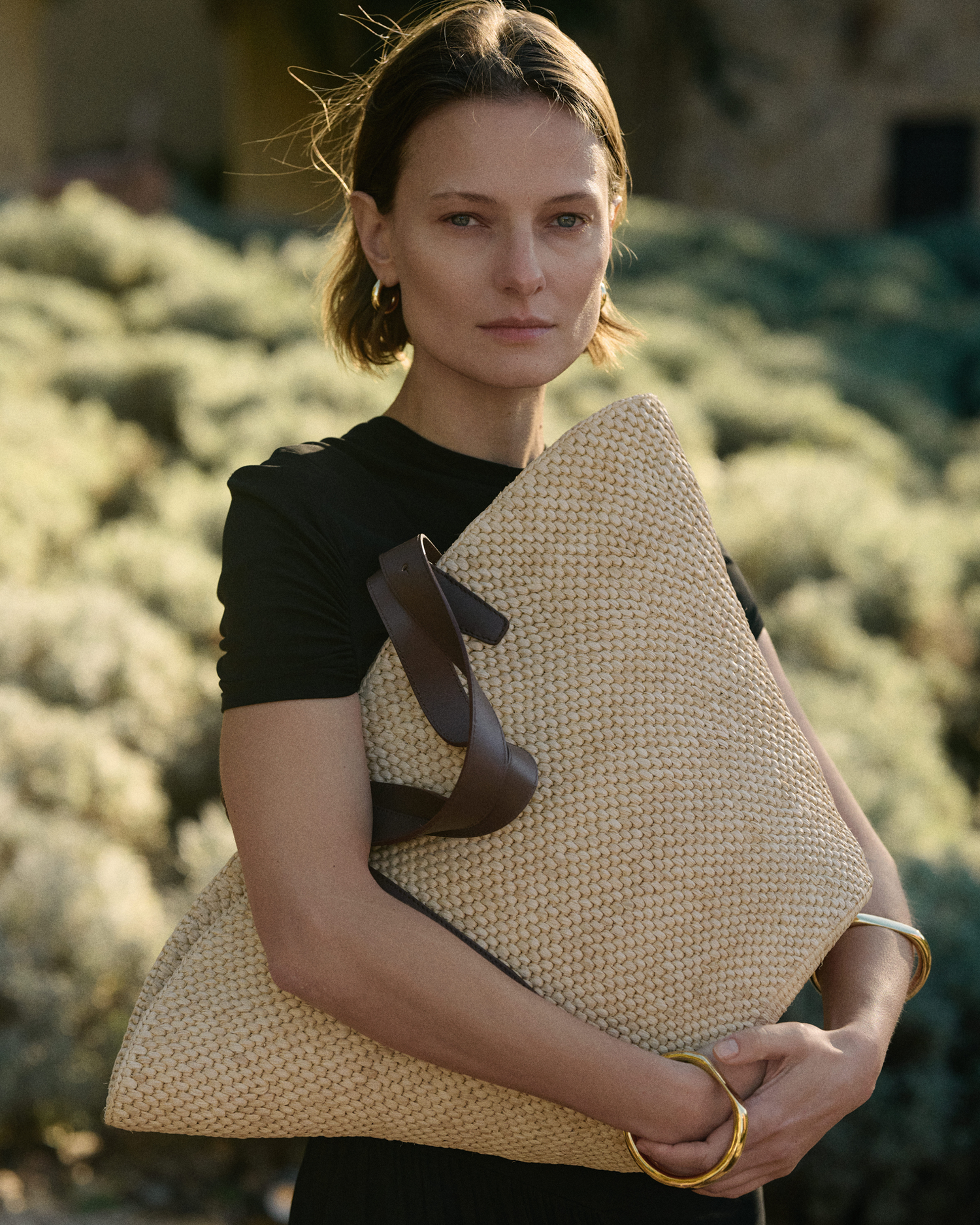 AVOID ABRASIVE SURFACES AND OVERLOADING: Raffia bags are designed for carrying light items. Avoid overloading your bag to prevent distortion or stretching of the fibers, as this can alter the raffia’s original form and structure. Additionally, avoid contact with abrasive surfaces to prevent brittleness in the fibers and scratches on the hardware and leather.